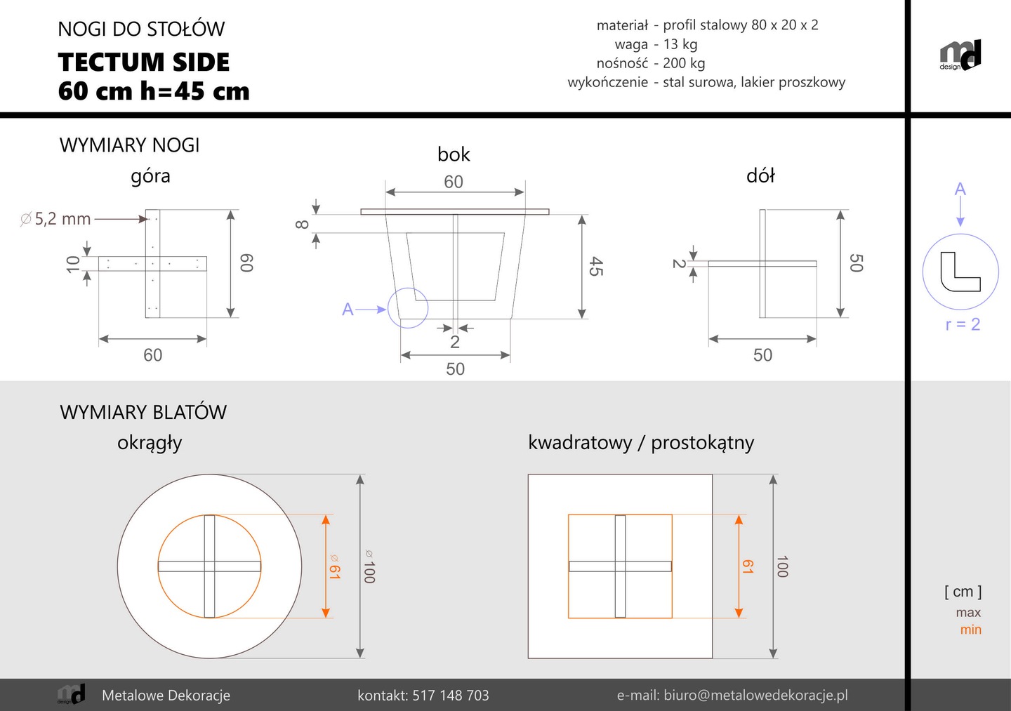 Benötigen Sie ein Tischbein, das einen modernen und doch zeitlosen Charakter hat? Sie haben es gerade gefunden! Das Metallbein für den Tisch Tectum Side M ist eine gute Wahl, wenn Sie zeitgenössisches Design und universelle Eleganz schätzen. Dieses Modell passt sowohl unter runde als auch unter quadratische Tischplatten. Der Durchmesser (bzw. Länge und Breite) des Kreisels sollte zwischen 61 cm und 100 cm betragen. Tectum Side M ist ein Bein aus 80×20 mm Stahlprofil und für Holz- oder Brettertische konzipiert. Die Beinhöhe beträgt 45 cm.